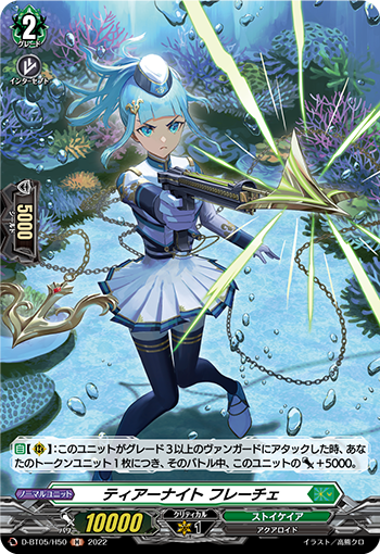 D-BT05/H50 H- Common unit Tears Knight Freyja ティアーナイトフレーチェ nation primitive Race aquatic species grade 2 strength 10000 Shield 5000 [Auto][R]: When this unit attacks a vanguard of level 3 or higher, this unit gains +5000 Strength for each of your derivative units for this battle.