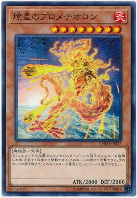 CHIM-JP025 燎星のプロメテオロン(燎星之天火流星神) 炎8星機械2800 2000 ①:這張卡的攻擊破壞主要怪獸區域的對方怪獸時,丟棄1張手卡才能發動。這張卡可以繼續攻擊。直到下個回合的結束時,那隻怪獸存在過的區域不能使用。