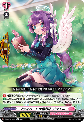 【自】:這個單位被放置到G時,選擇你的1個單位,這次戰鬥中,不會被擊中。你的手牌中的卡在2張以上的話,選擇手牌中的1張卡,捨棄。