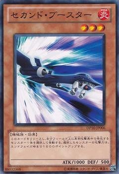 DP10-JP006 セカンド・ブースター(二次推進士) 炎3星機械1000 500 把這張卡解放,選擇自己場上表側攻擊表示存在的1只怪獸發動。選擇的怪獸的攻擊力直到結束階段時上升1500。
